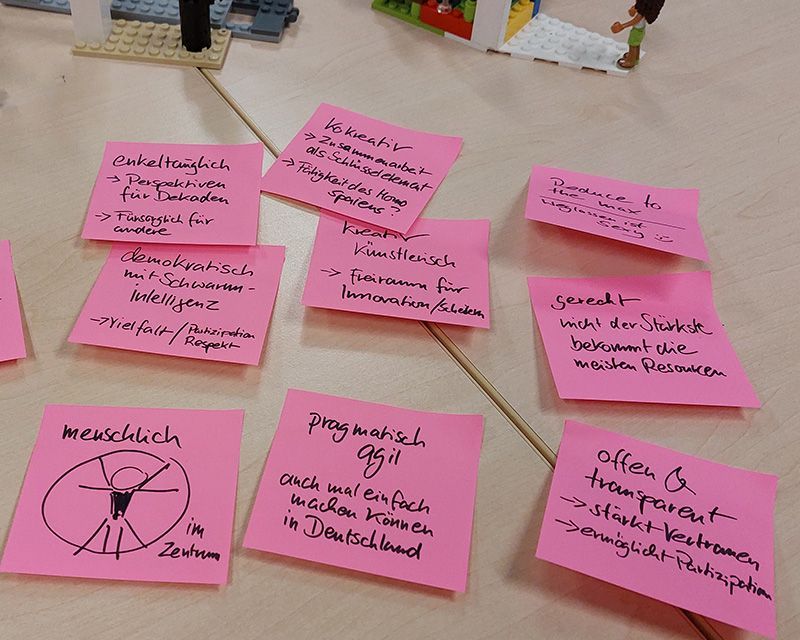 "Jeder bringt LEGO®, Playmobil®, Knete oder Design Thinking Material vor den Bildschirm zum Gestalten. Gemeinsam gehen wir durch einen individuellen Reflexionsprozess (siehe Video) und tauschen uns über unsere Erkenntnisse aus."